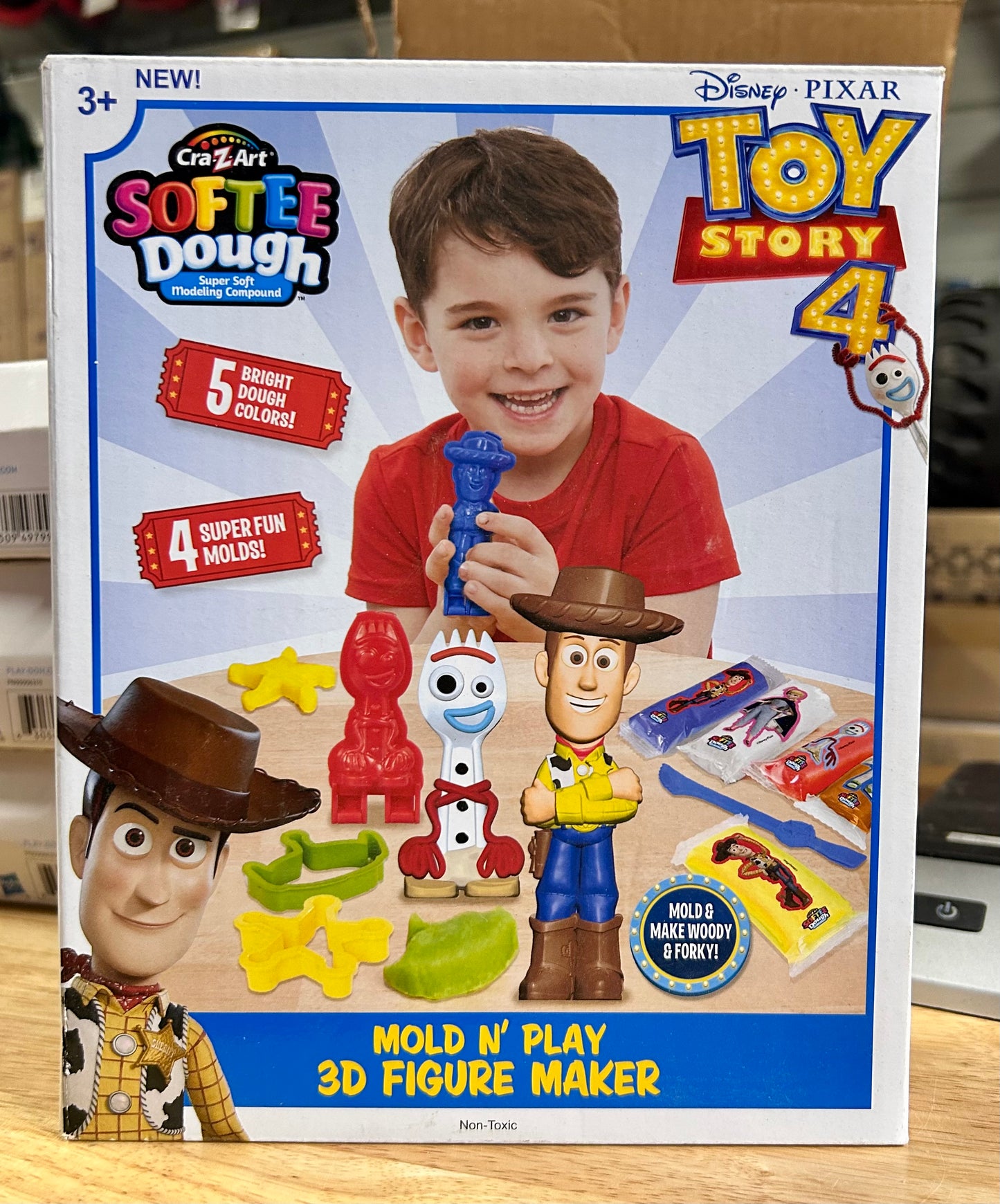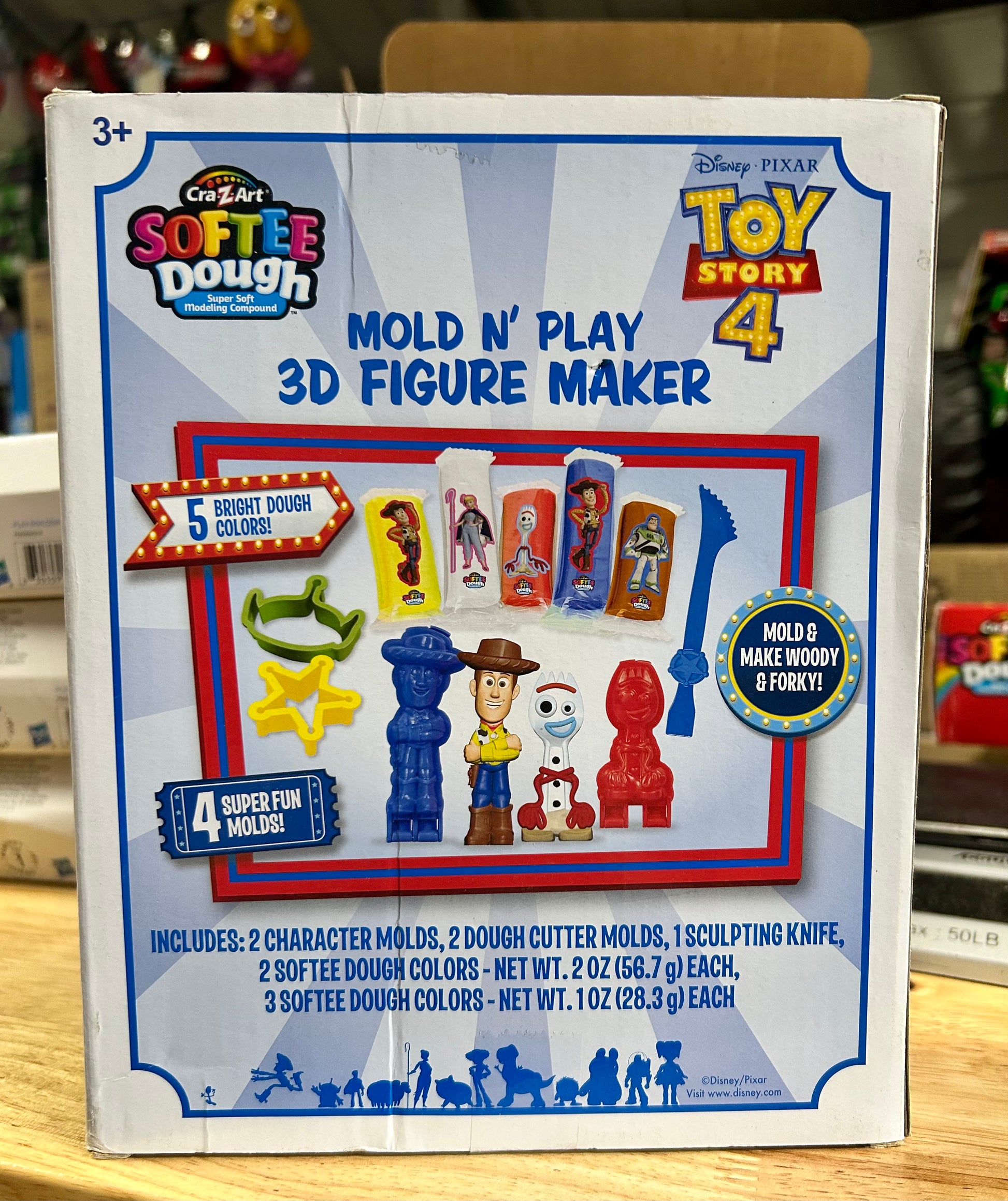 Disney Toy Story 4 3D Figure Maker by Cra-Z-Art! Create cute Toy Story Softee Dough Characters! Includes 3 Softee Dough 1 oz Colors, 2 Softee Dough 3 oz Softee Dough Colors, 2 Character Molds, 2 Dough Cutters and Scuplting Knife.