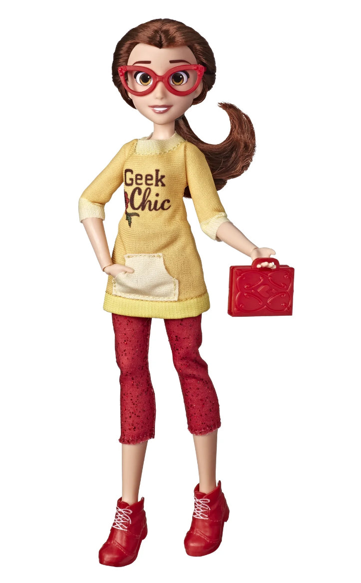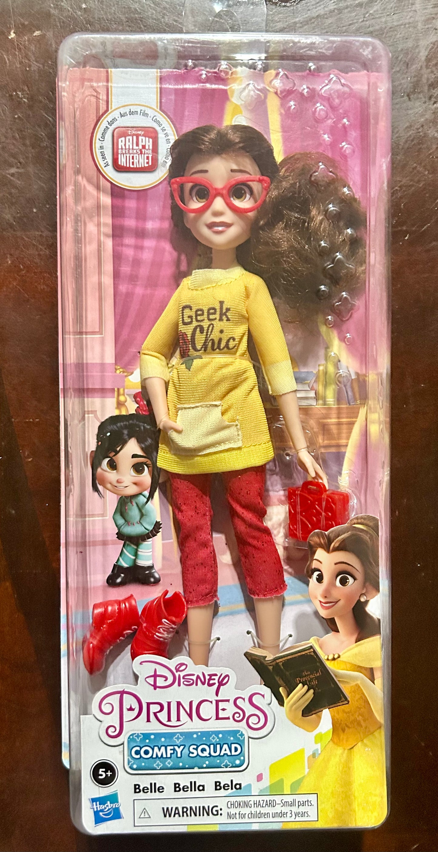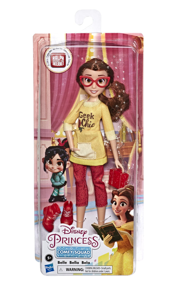 In Disney's "Ralph Breaks the Internet," Vanellope von Schweetz--along with her best friend Ralph--ventures into the uncharted world of the internet. When she finds herself surrounded by Internet avatars of the Disney Princess characters, she's surprised to learn that she actually has a lot in common with them. Inspired by the Princess from Disney's "Ralph Breaks the Internet" movie, this Belle doll is dressed in a casual, comfy outfit with fun, modern-day accessories. The Belle doll has beautiful long hair pulled back in a ponytail and wears a comfy cute outfit consisting of a cute top that reads " Geek Chic ," a pair of leggings, and sneakers. She also comes with a pair of glasses and a book accessory, of course! This Comfy Squad Belle doll is a great start to a collection of Disney Princess dolls with a fun twist, inspired by Disney's "Ralph Breaks the Internet" movie.