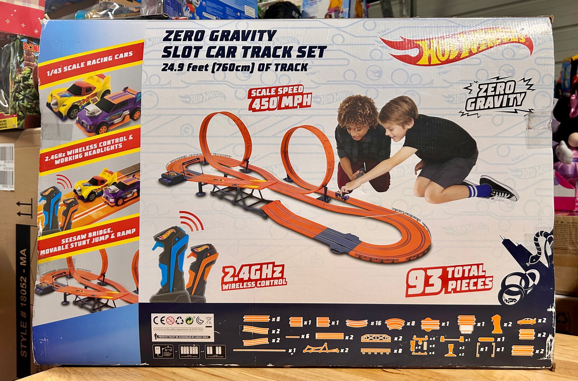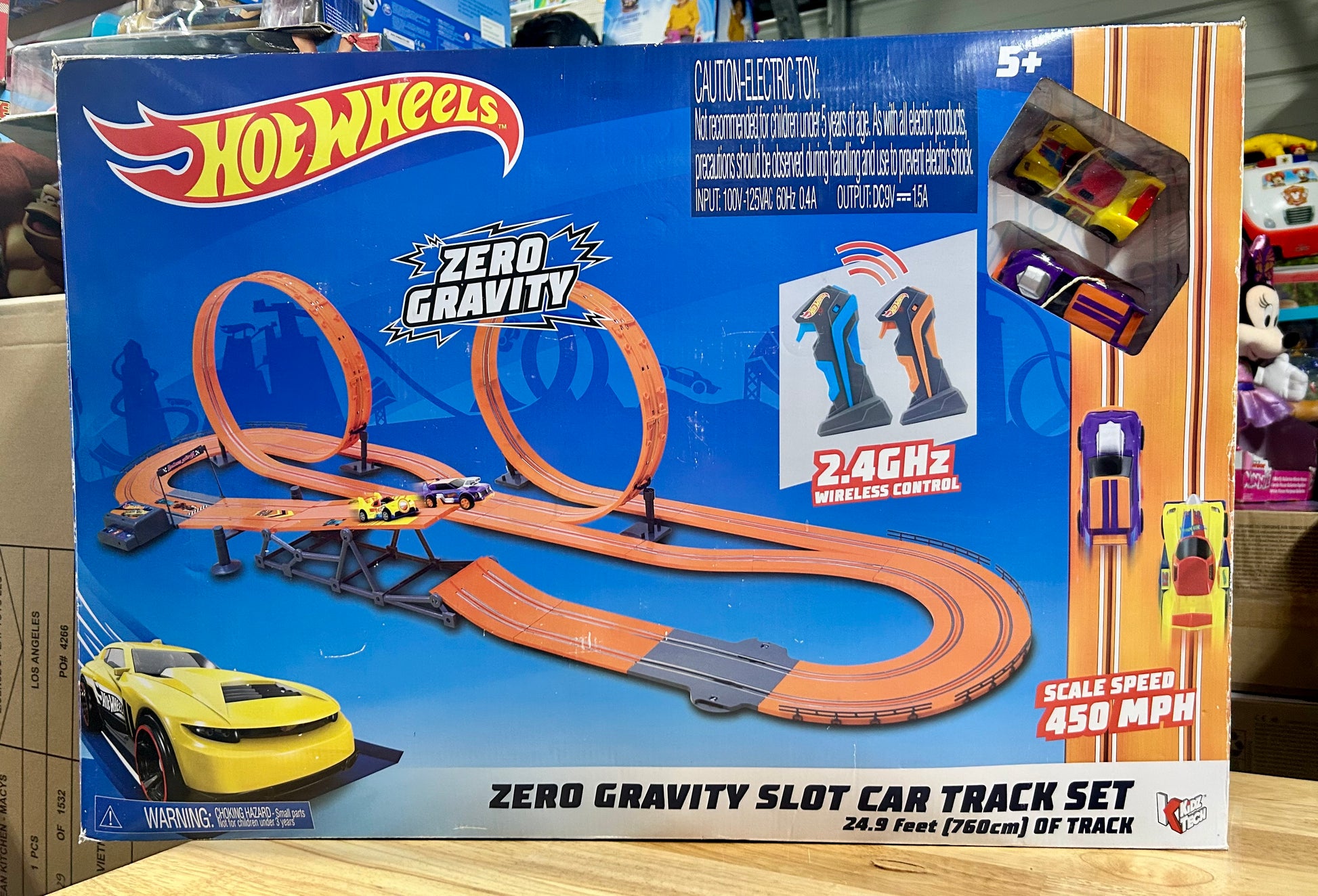 It's not the same without the flame! Race your friends with the Hot Wheels Anti-Gravity Slot Car Track Set. This awesome car track set comes with two 1/43 scale racing cars with two 2.4GHz wireless controls. The colorful Hot Wheels cars even have working headlights! The track set includes 93 total pieces including a seesaw bridge and a movable stunt jump and ramp. You'll be racing through loops and jumping the stunt ramp to be number one! This slot car track set would make an amazing holiday gift or a sweet birthday gift. This toy is designed for children five years and older. Experience Anti-Gravity with this Hot Wheels Slot Car Track Set. Hot Wheels Anti-Gravity Slot Car Track Set, 24.9':