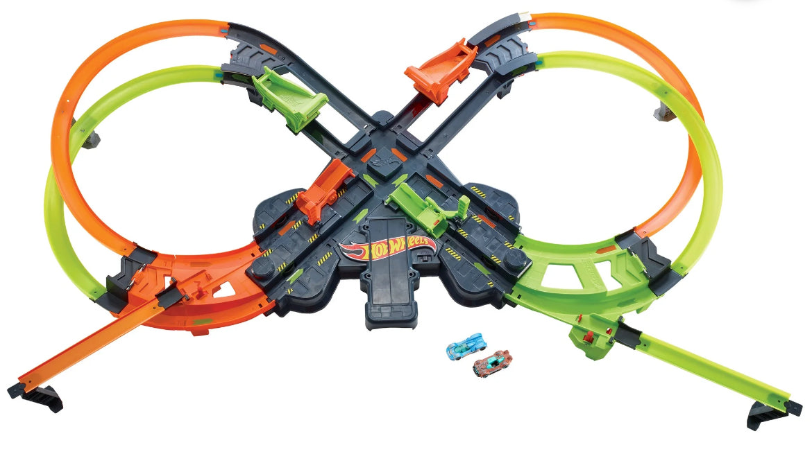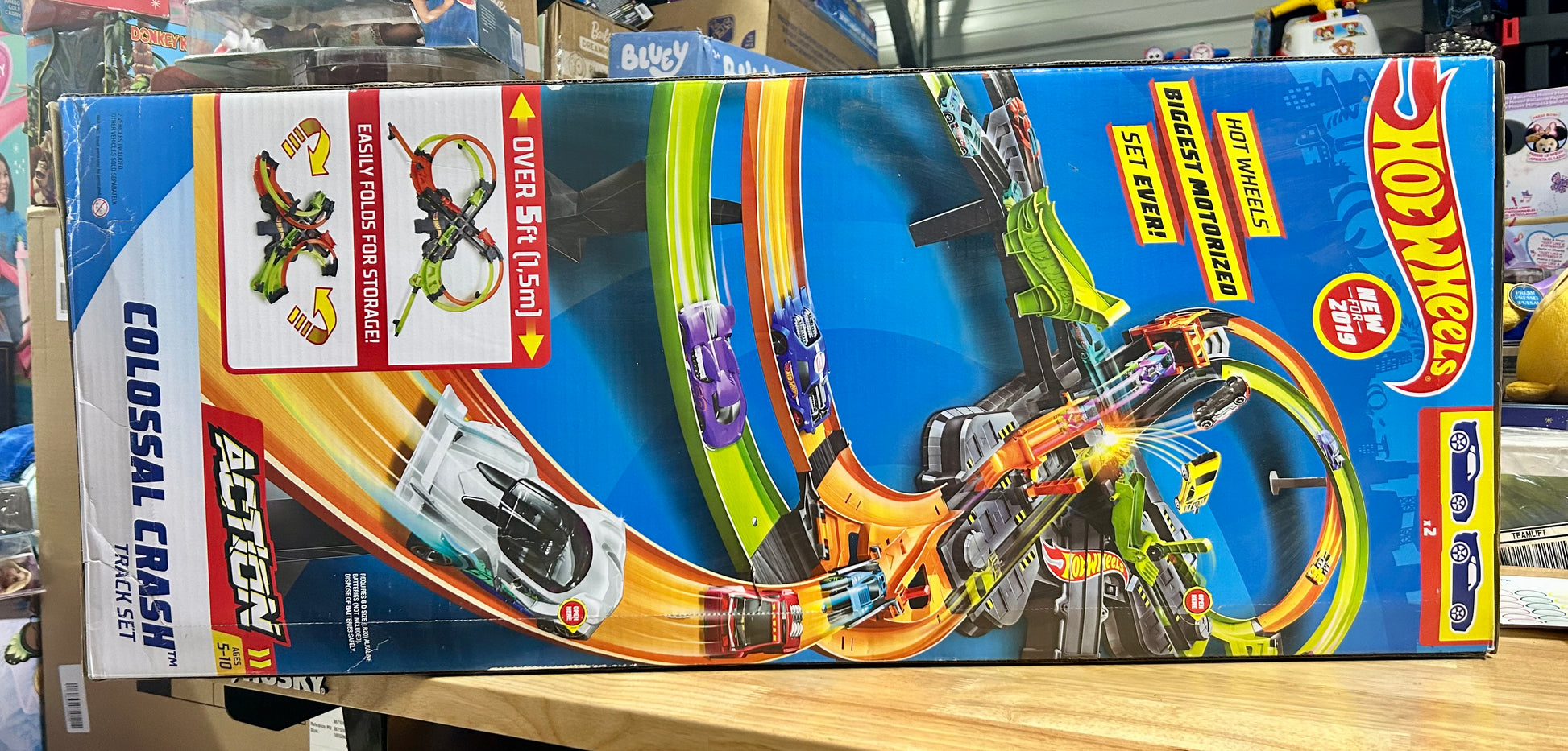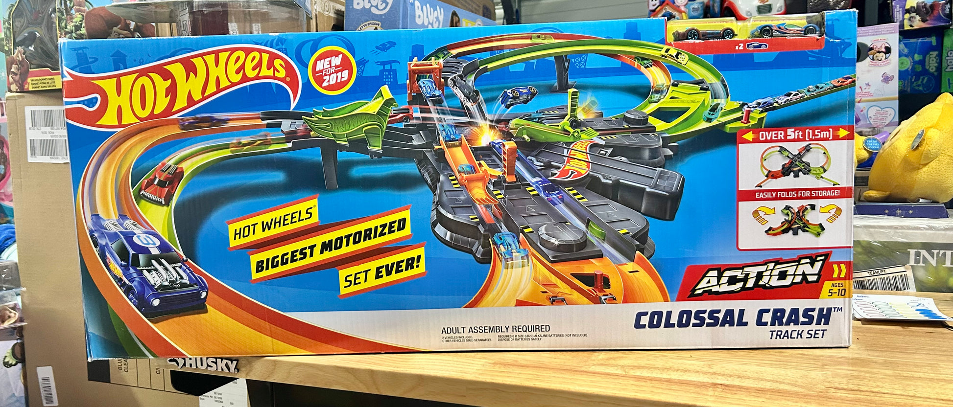 Hot Wheels Colossal Crash track set is the ultimate, show-stopping, top-of-the-list toy for the Hot Wheels Action Boy! New for 2019, the biggest boosted set Hot Wheels has ever made, this track's layout is over 5 feet wide. It's packed with speed and boosted action to get your cars crashing and smashing! Double figure-eight design offers multi-player fun, lets you race lots of cars at once, and ups the potential crash factor! Use the levers to control the action. You can send your cars zooming through the crash zone on the ground or into the air for spectacular aerial crashes! Set folds up in a couple easy steps for easy storage. Hours of competitive fun for Hot Wheels lovers!