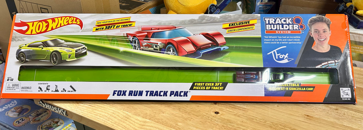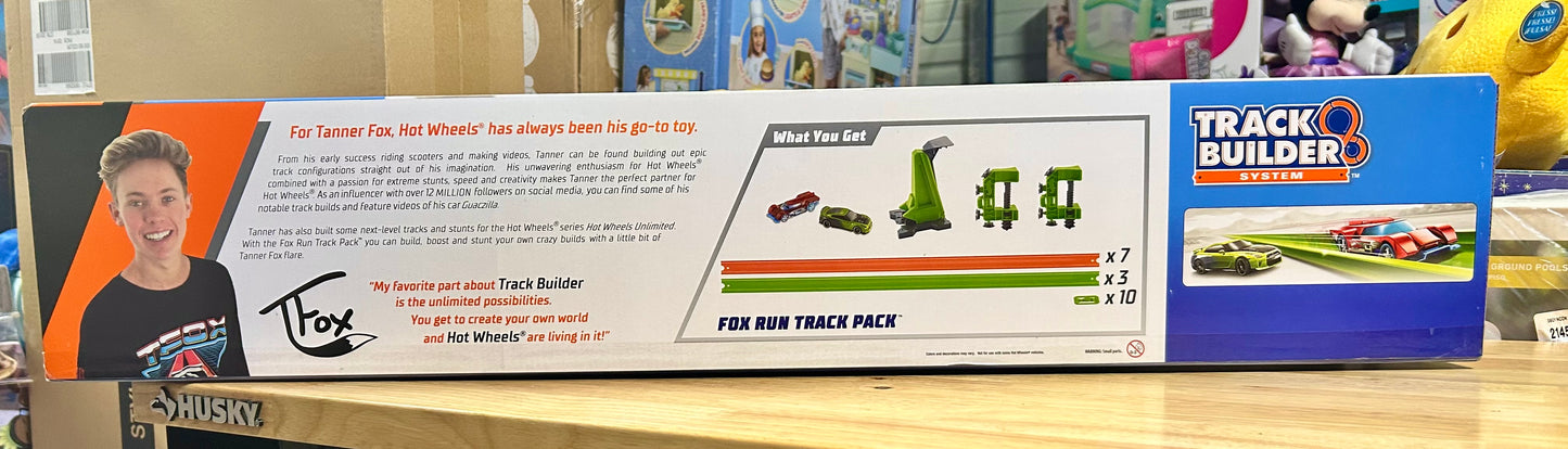 Are you ready for the Fox Run Track Pack? With 30 feet of track, and exclusive green clamps, launcher, and connectors, kids can build super long crazy tracks. The Fox Run Track Pack was made in partnership with Tanner Fox, and includes two Hot Wheels cars, one of which is Tanner Fox's exclusive replica GUACZILLA! Whether he's riding scooters or making videos for his 8 million followers on social media, Tanner Fox is always ready to build epic track configurations straight out of his imagination. His enthusiasm for Hot Wheels combined with a passion for extreme stunts, speed and creativity makes Tanner the perfect partner for Hot Wheels.