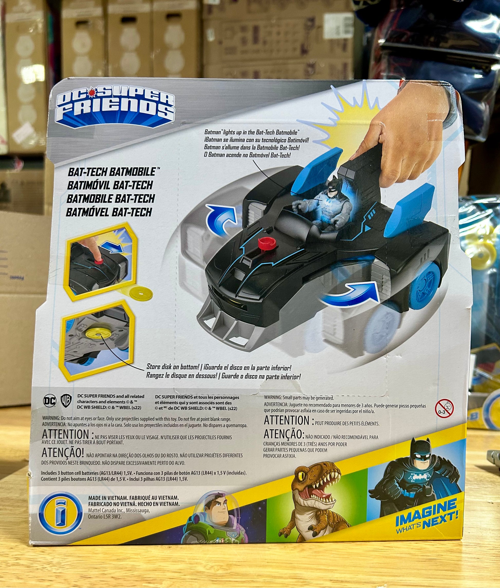 - Place figure in the driver's seat and press the trigger to see his chest light up! Bring this figure to the Imaginext Bat-Tech Batcave for more light-up action. (Playset sold separately and subject to availability.)