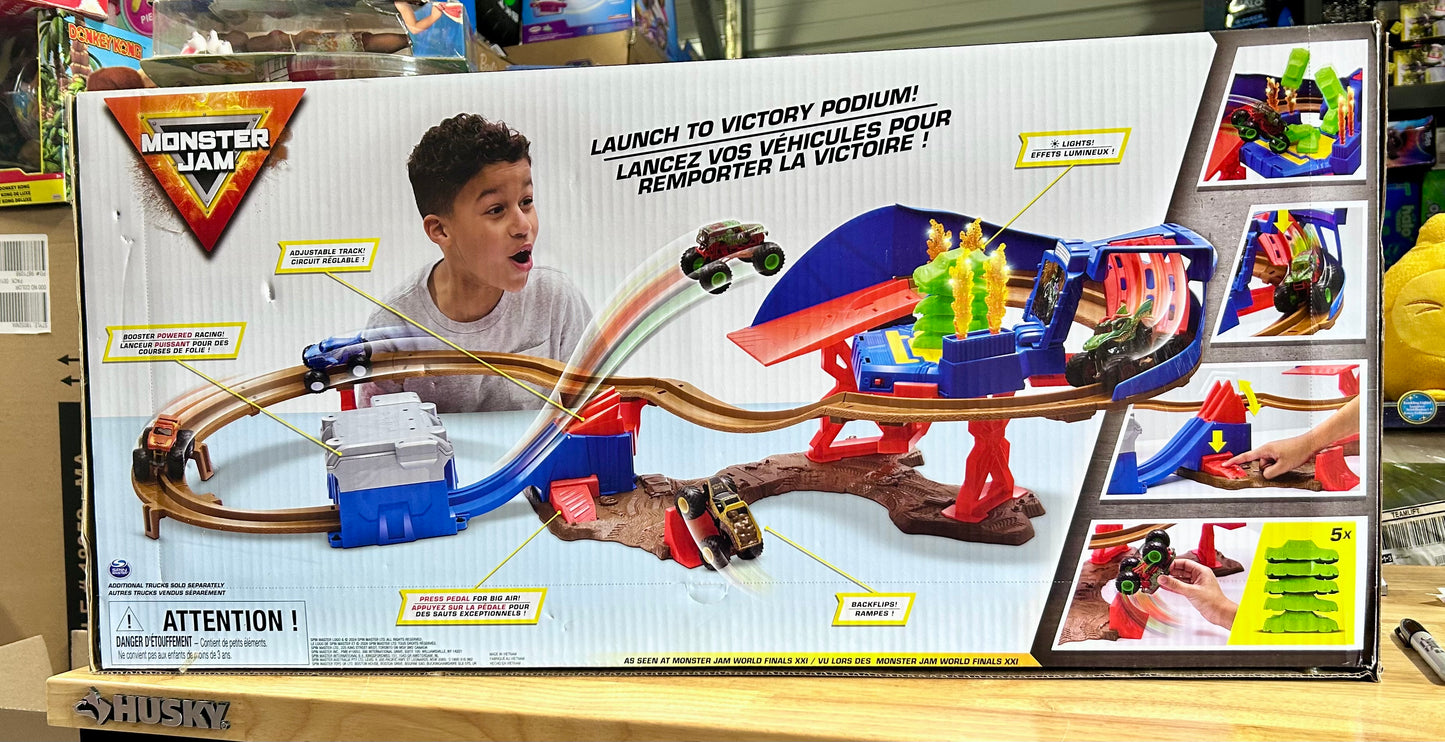 The Supercharge Speedway playset is where the Monster Jam World Finals roar to life! Perfect for young Monster Jan fans, this impressive playset features a figure-8 loop track that’s a non-stop thrill ride, offering continuous Monster Jam action. Includes two iconic 1:64 scale monster trucks: El Toro Loco and the fearsome Megalodon. With exquisite details, from the authentic BKT Tires to the shiny chrome rims, these trucks are crafted to look just like their gigantic counterparts. With some assembly required, kids will be wide-eyed as they launch their trucks into super jumps, crash through obstacles, and celebrate each win with a spectacular landing on the Victory Podium. It’s suitable for children aged 3 and up, making it a prime gift for both boys and girls. Add more Monster Jam trucks to the race like Grave Digger monster truck, Zombie, and more (sold separately) for a full lineup and extended play. Easy to assemble, with excitement built to last, this set promises hours of fun. Monster Jam toys like remote control car and trucks are the perfect gifts as girl and boy toys, ages 3 and up.