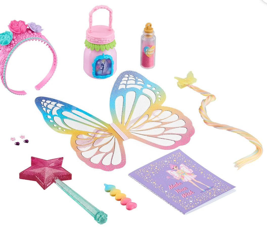 Bring fairy tales to life with the My Life As Fairy Play Set for 18-inch Dolls. This magical set of fairy accessories will encourage hours of creative and imaginative play. There’s a colorful hair extension and adhesive stickers that they both can wear as they travel through the world of wonder and fantasy. Includes 1 flower crown, 1 set of fairy wings, 1 star wand, 1 fairy jar, 1 sheet of adhesive earrings, 1 butterfly clip with multi-colored hair extension, 1 bottle of fairy dust, 1 heart pen, and 1 journal for writing down wishes.