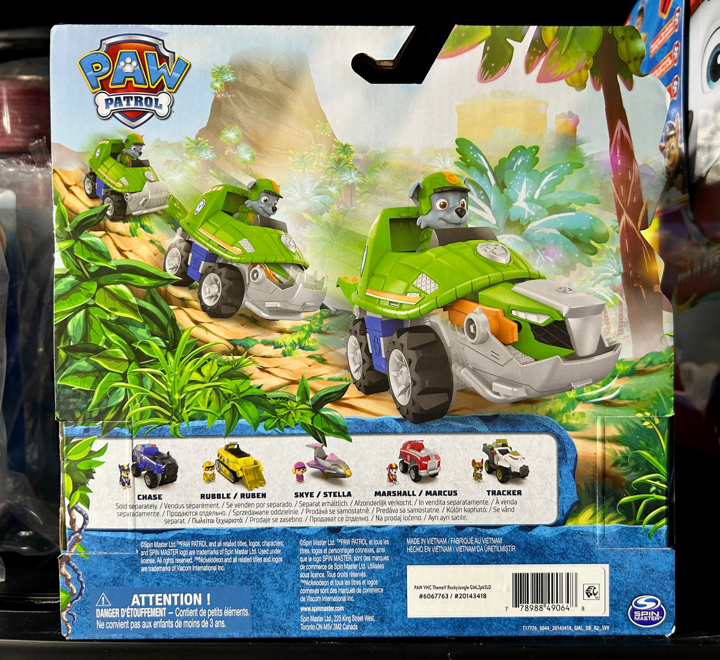 Rocky’s vehicle features an exciting transformation into rescue mode, by pushing down on the front of his vehicle, to expose the turtles beak then pulling out the tail, from the rear of the vehicle, before opening the turtles mouth, to complete the transformation! Use its tail and beak to clear away any obstacles and save the day! For even more fun and exciting PAW Patrol series-inspired missions, collect all the PAW Patrol Jungle Pups toys and the PAW Patrol: The Mighty Movie toys, like the awesome Aircraft Carrier HQ and all the special edition PAW patrol toys for girls and boys, like the Mighty Pups, Aqua Pups and Big Truck Pups toy figures and playsets (each sold separately). With PAW Patrol preschool toys, a kid can explore his or her imagination, and develop their motor skills through pretend play, as they relive their favorite scenes from the shows. Enjoy endless PAWsome adventures with Rocky and his Jungle Pups Snapping Turtle Vehicle!