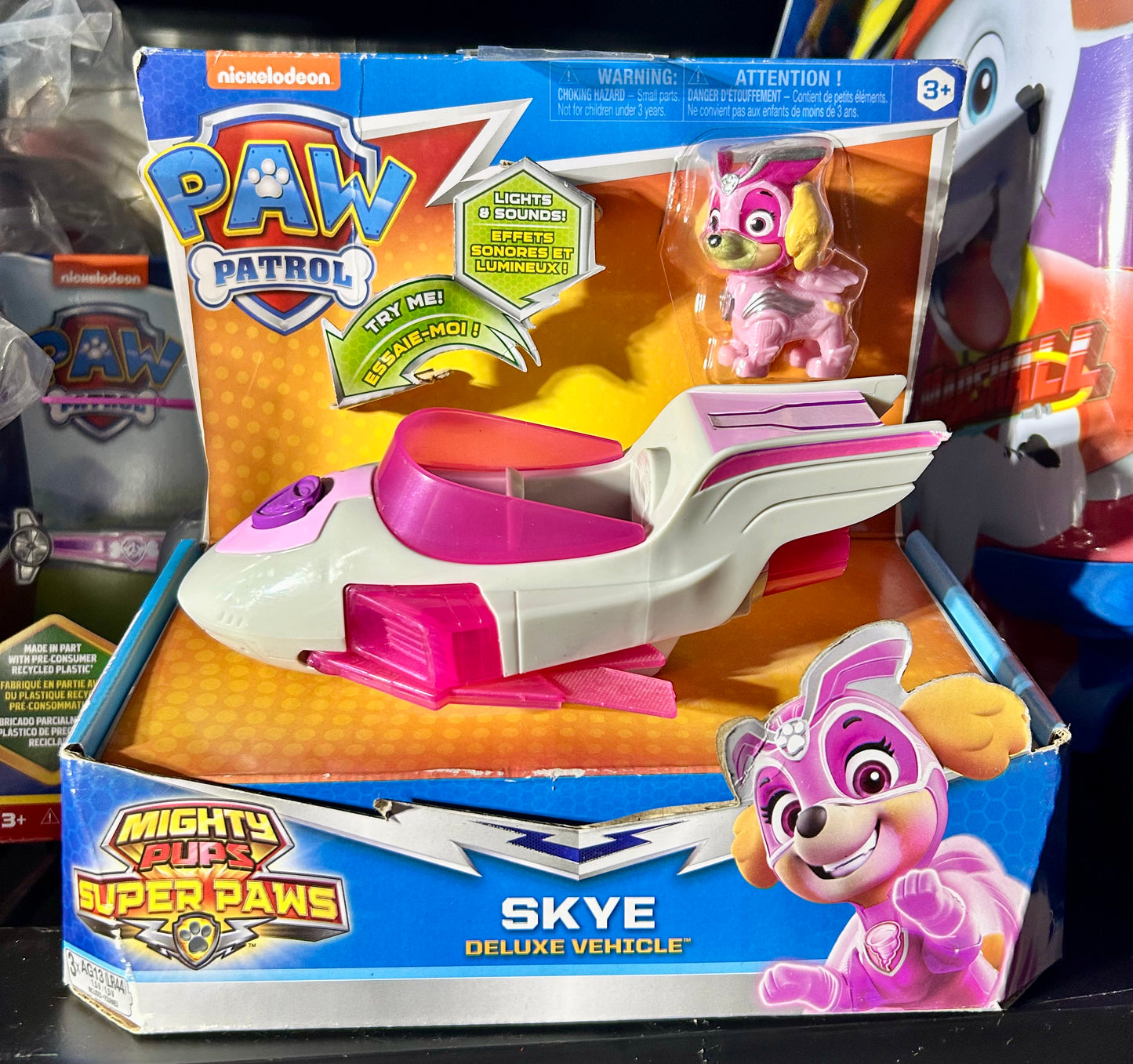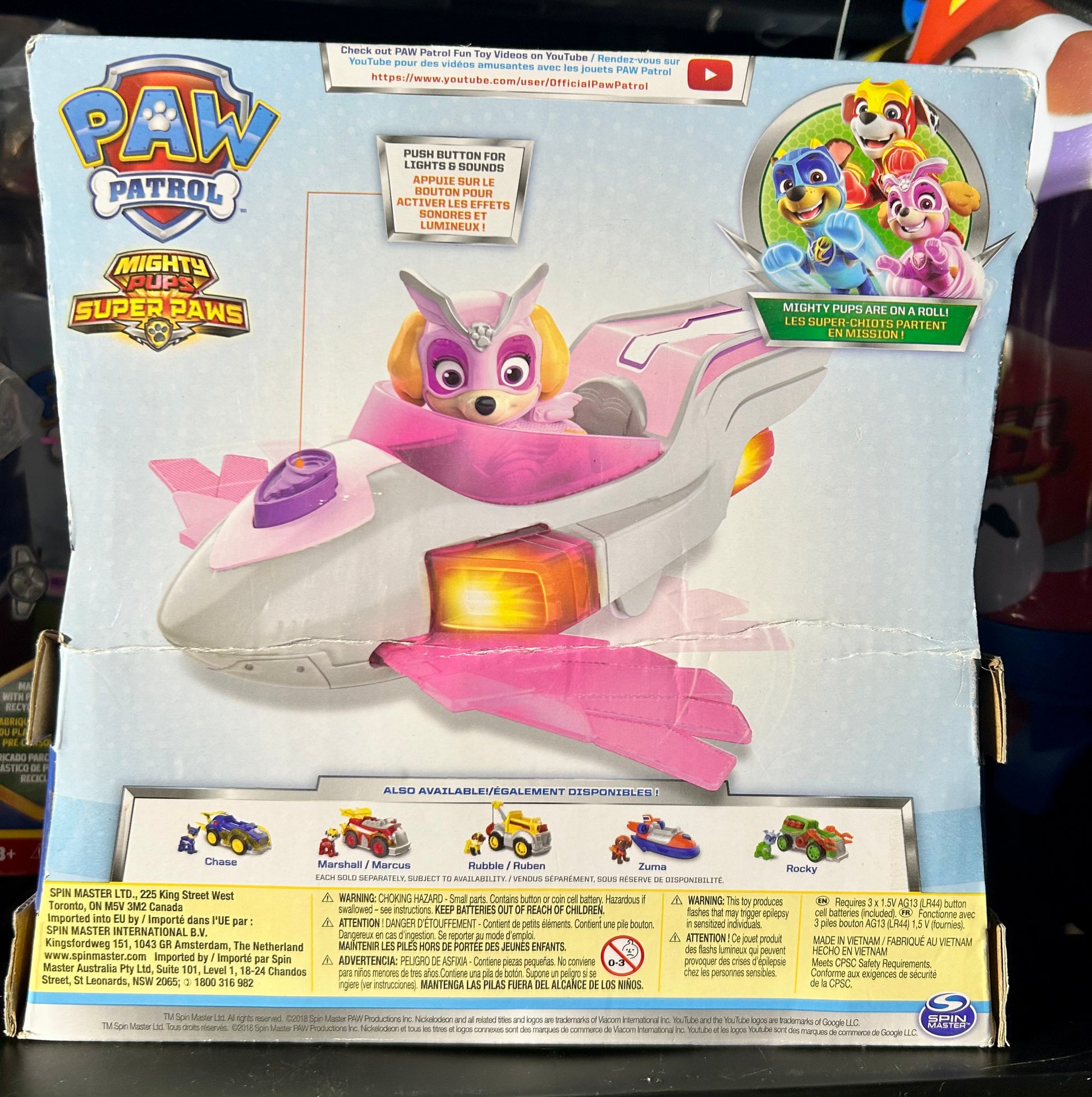 Mighty Skye is ready for mighty action in her Super PAWs Deluxe Vehicle! With Skye (figure included) behind the wheel of her jet, it’s time to race to the rescue! Skye’s Super PAWs Deluxe Vehicle is equipped for action-packed mighty rescue missions, with lights and sounds, expandable wings, and real working wheels! Push the button on the front of the jet to activate the lights and sounds – translucent accents light up as it makes exciting sound effects! Pull the detailed pink feather wings out of the jet and fly through the skies! Collect the rest of the Super PAWs pups and Deluxe Vehicles (each sold separately) and team up to help save the day! Join Skye on rescue missions with her Mighty Pups Super PAWs Deluxe Vehicle!