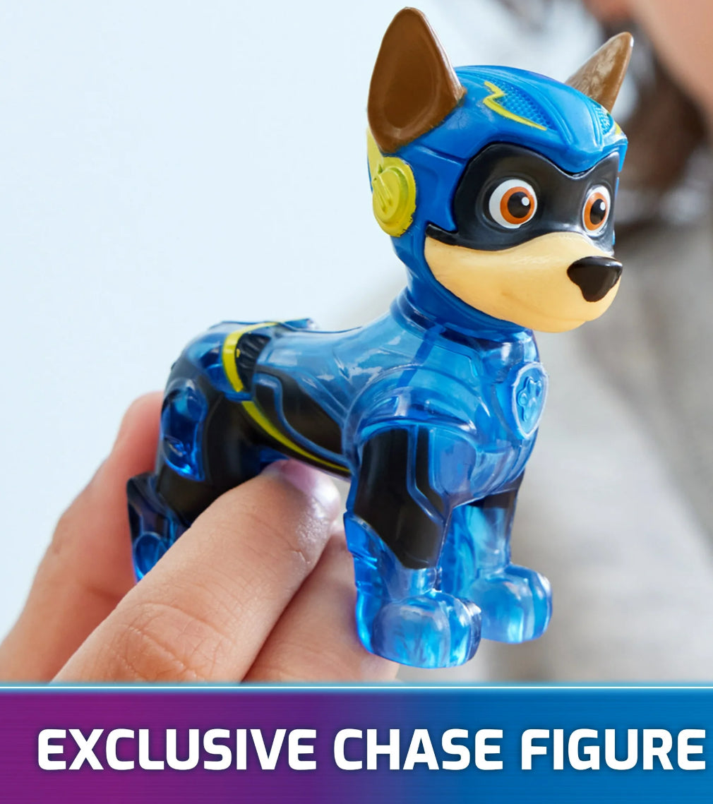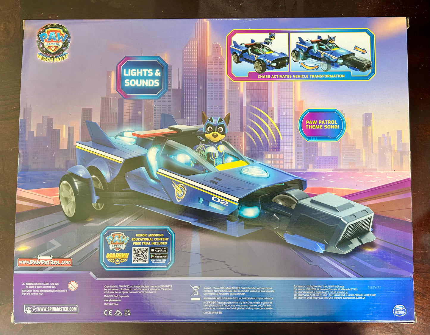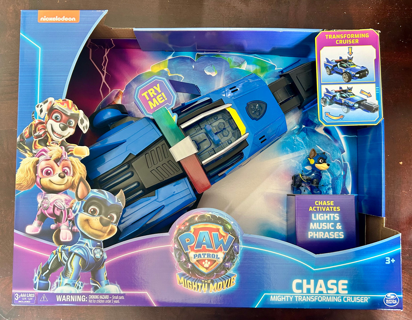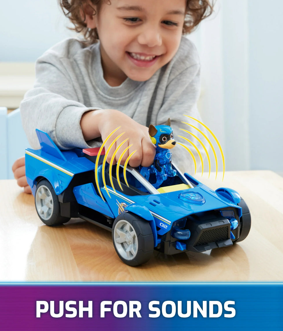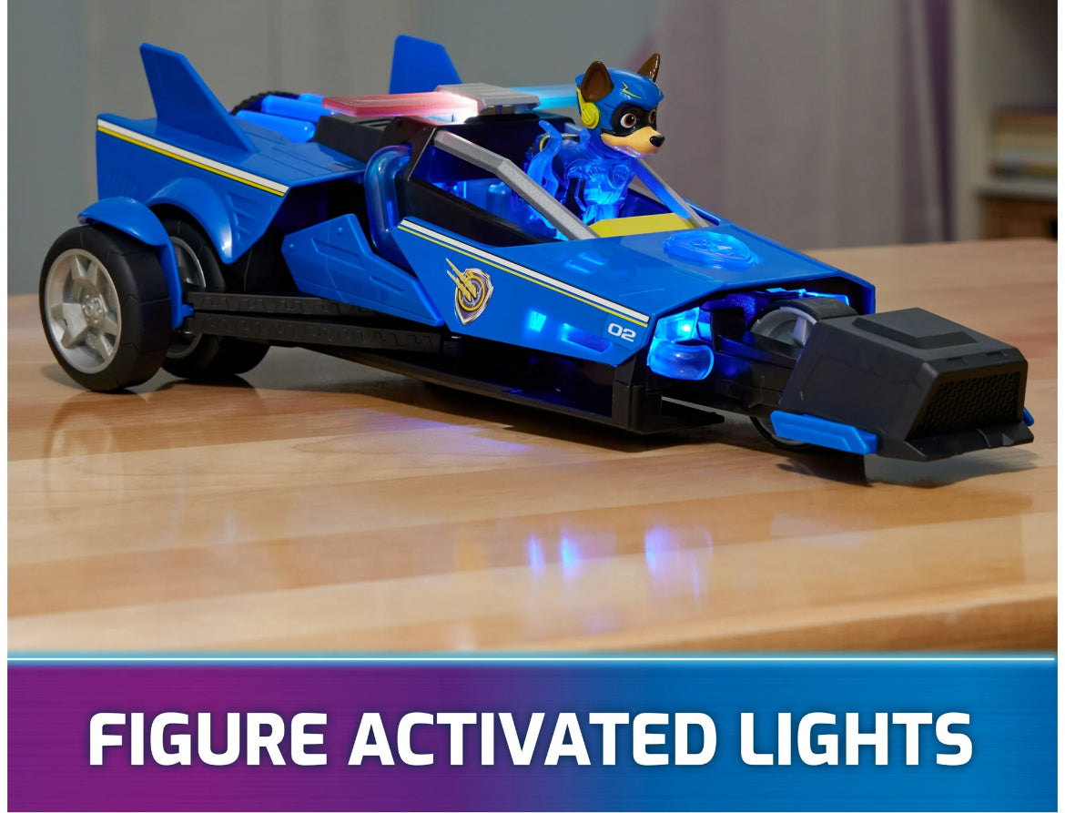 Team up with Chase and his PAW Patrol: The Mighty Movie rescue vehicle, for exciting rescue adventures right off the big screen! This PAW Patrol toy car measures over 12-inches long, 6-inches wide and stands 4-inches tall, with a super-sleek design, an awesome vehicle transformation and exciting sound effects and music, with synchronized flashing lights, that you see and hear in the movie! This deluxe police themed race car rescue vehicle would make a great gift for kids that are fans of the PAW Patrol Movie (Batteries Included)! Dressed in his blue PAW Patrol: The Mighty Movie uniform, with translucent sections and a cool helmet, clip your Chase action figure onto the seat of his police car toy to illuminate multiple areas on Chase and his vehicle, and watch his paws light up! Then, when it’s time for an action packed rescue mission, press down on Chase to activate his vehicle transformation, into rescue mode, which extends his vehicle to over 15-inches long and a whopping 8-inches wide, as you roll your toy car around from one mission to another! With PAW Patrol toys, a kid can explore his or her imagination and develop their motor skills through pretend play while reliving their favorite scenes from the movie! For even more fun and exciting PAW Patrol series-inspired missions, collect all the PAW Patrol movie toys, like the awesome Aircraft Carrier HQ and all the special edition PAW Patrol toys for girls and boys, like the Mighty Pups, Aqua Pups and Big Truck Pups toy figures and playsets (each sold separately) to enjoy endless PAWsome adventures with your favorite hero pup, in the Chase Mighty Transforming Cruiser!