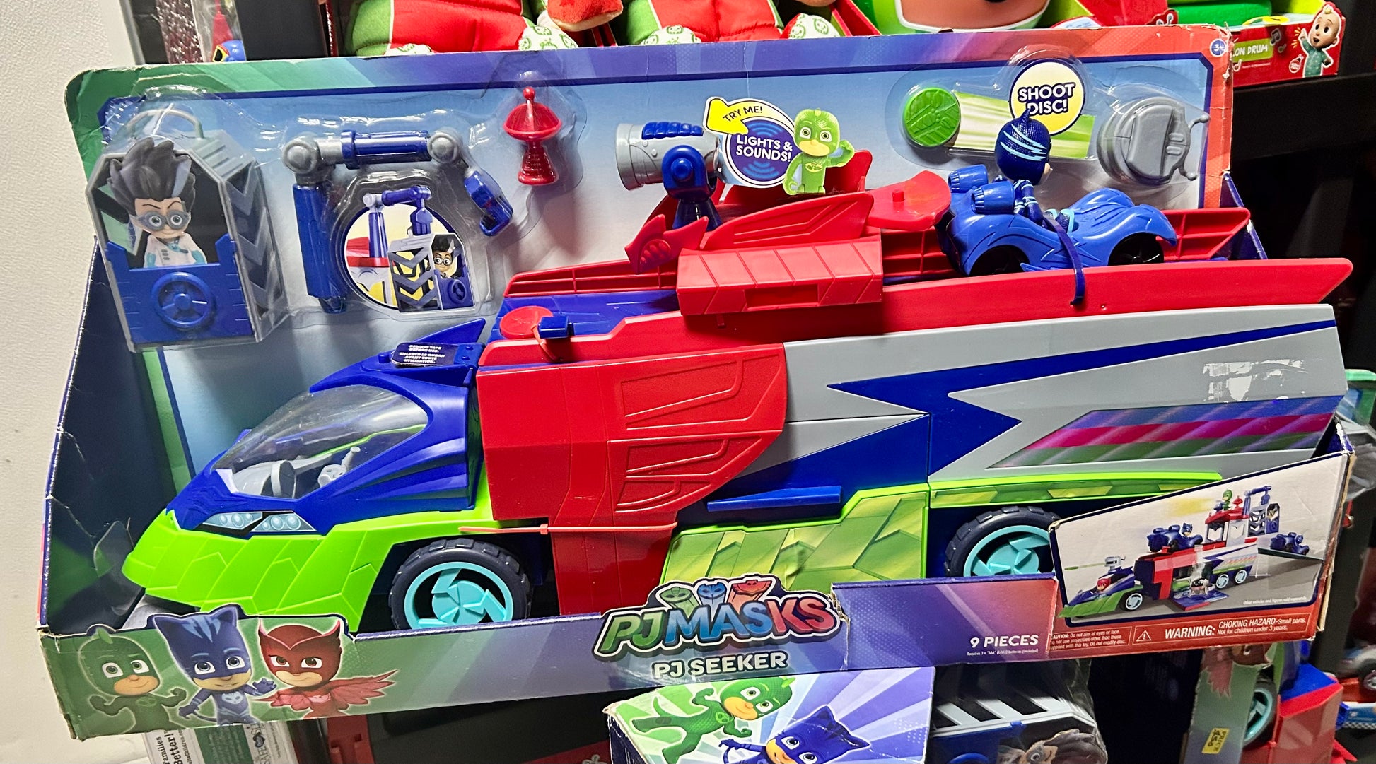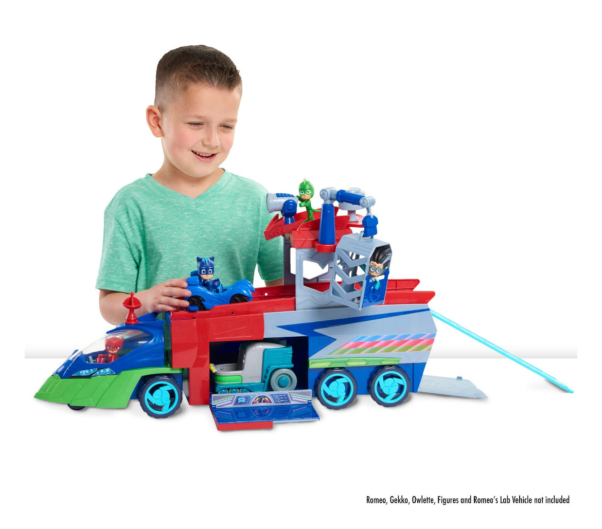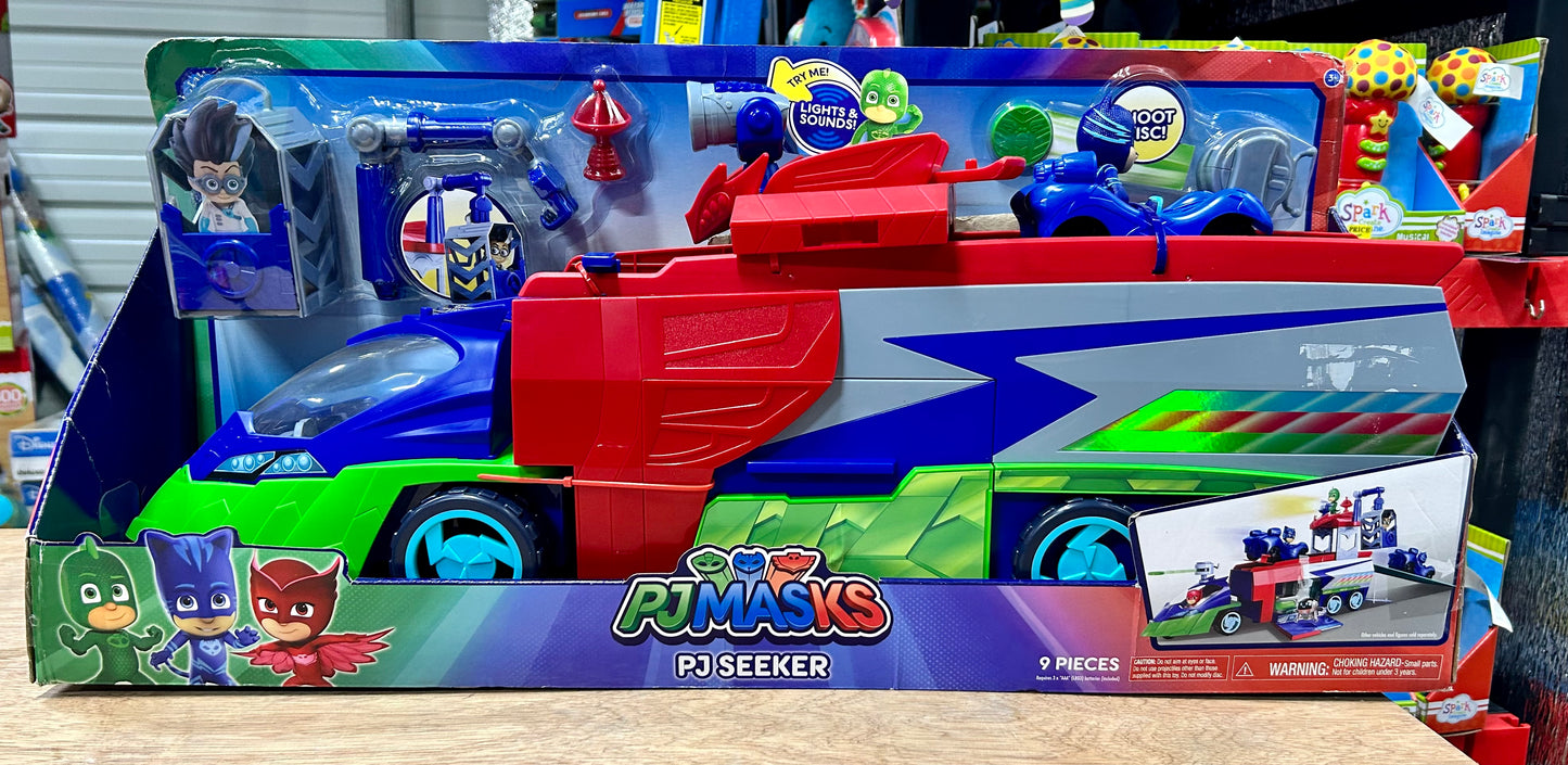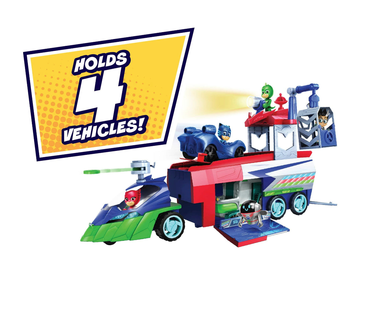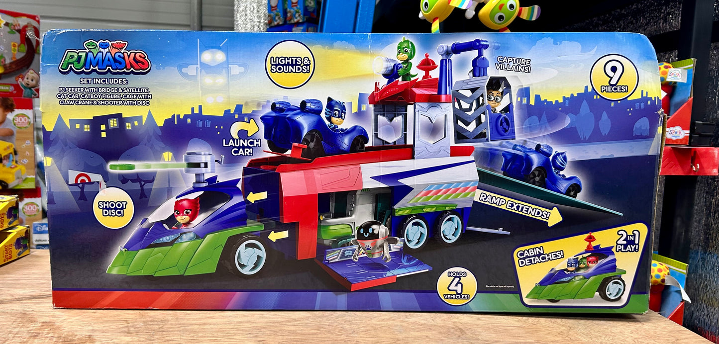 Be on the lookout for the Nighttime Villains with the PJ Masks PJ Seeker! Featuring lights, sounds, and a show-inspired design, the PJ Masks PJ Seeker can fit up to four vehicles in the detachable carrier and up to three 3” PJ Masks figures in the cabin. Spot the Nighttime Villains in the dark with the light-up searchlight. Save the day and stop them in their tracks with the disk launcher. Kids can even trap villains in the detachable cage! With the push of a button, release the Seeker’s cabin from the carrier for a quick pursuit of escaping villains! The PJ Seeker even features a pull-out ramp and drop-down side door. The set includes one 3” Catboy figure and mini Cat-Car! Other PJ Masks figures sold separately. Requires 3 x AAA batteries (included). Ages 3+