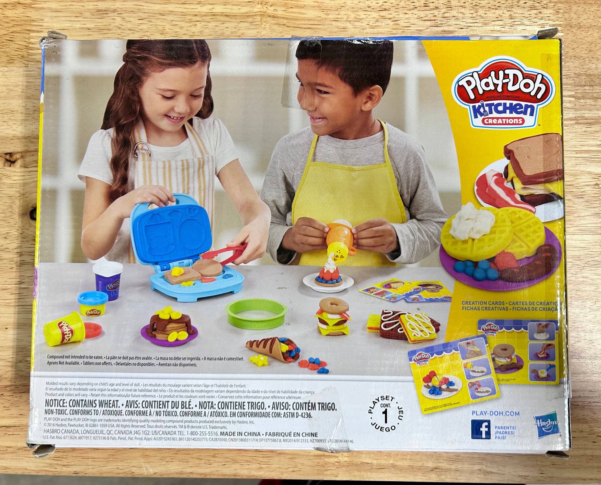 Play-Doh breakfast time is the best way to start the day! Create the most colorful pretend breakfast menu imaginable with the waffle maker and accessories. There's so much to create, Play-Doh breakfast time might even take up the whole day! Multipurpose Waffle Maker This double-decker waffle maker doesn't just make wacky waffles but it makes almost any Play-Doh breakfast dish imaginable! Open the top to shape square or round Play-Doh waffles, silly sausages, and make-believe fruits and vegetables. The bottom half creates pretend pancakes, imaginary toast, and Play-Doh toppings. There are also lots of half-molds on top of the waffle maker to make even more silly breakfast shapes! Creative Kitchen Tools The fun doesn't stop at the waffle maker! The syrup bottle can make silly syrup, funny fruit topping, or even fluffy Play-Doh Plus whipped cream, and it can also be adjusted to change the shape of the topping as it "pours" out. Use the cutters, plate, and half-molds to create crazy crepes and croissants, make-believe bagels, and other creations. The 3 double-sided creation cards feature step-by-step tutorials for more culinary inspiration! Hasbro, Play-Doh, and all related properties are trademarks of Hasbro.