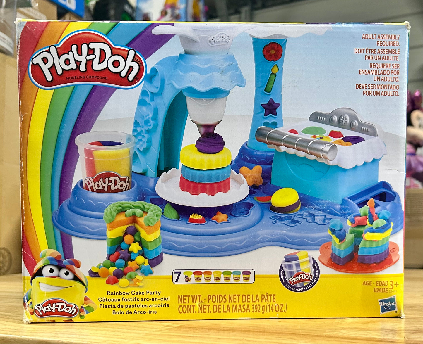 Create the most rainbowy Play-Doh cakes imaginable! With 7 Play-Doh cans including Play-Doh Rainbow Compound with 3 colors in 1 can, aspiring bakers can squish, shape and swirl these colors into colorfully magical Play-Doh cakes. Make the pretend cakes in 6 different shapes with the oven mold and cutters, then go wild with decorations! The frosting tower features a spinning turntable for swirls of Play-Doh frosting and kids can make all kinds of whimsical shapes with the half-molds on the playset. Display the creations in the cake dome, or with the plates and utensils. The playset also comes with 2 double-sided creation cards with step-by-step pictures of more fun things to make. This Play-Doh cake toy is a great activity or gift for kids 3 and up who love rainbows and getting creative with arts and crafts like modeling clay! Hasbro, Play-Doh and all related properties are trademarks of Hasbro.