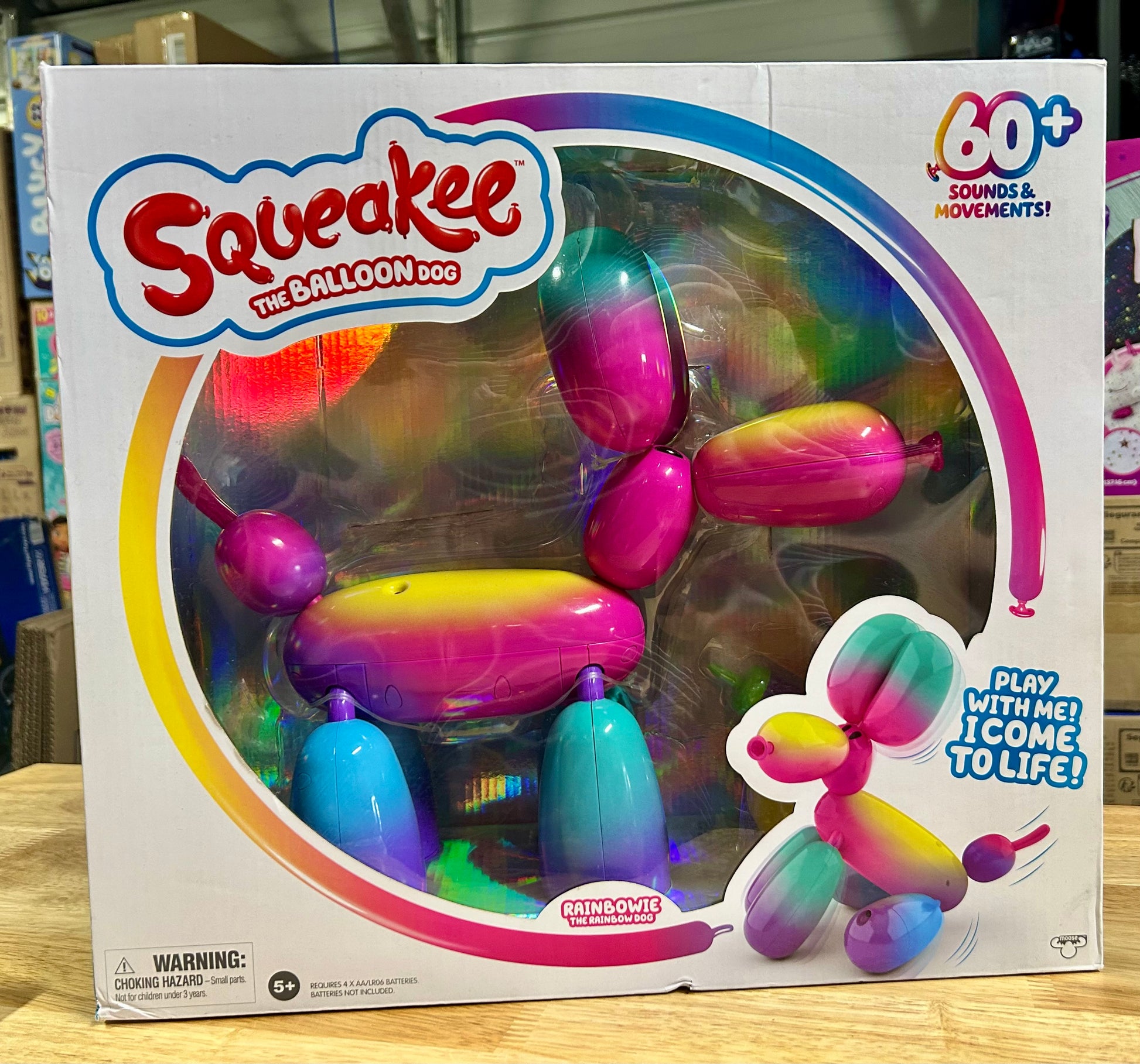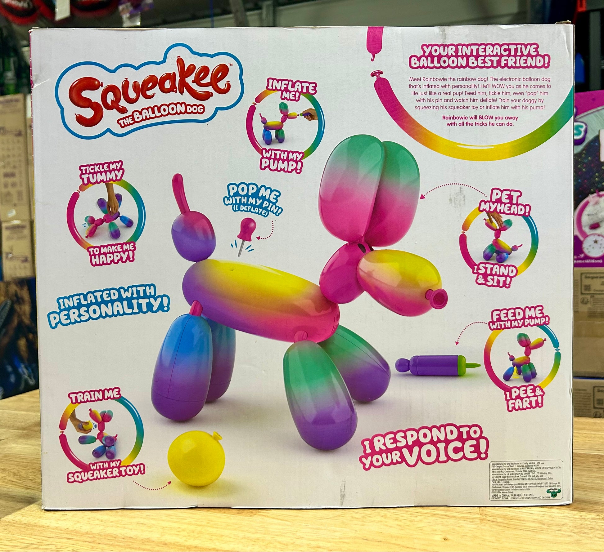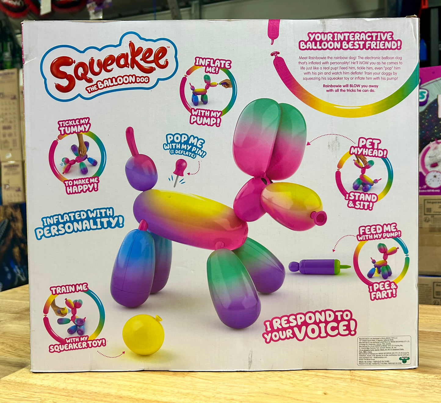 Meet Rainbowie the Rainbow Dog! The exclusive colorful rainbow dog balloon pet that’s inflated with personality! She’ll WOW you as she comes to life, just like a real pup! Squeakee Rainbowie is so interactive and loves to play with you! This very playful toy responds to your voice, and has over 60 sound and reactions. She looks just like a real Balloon Dog! Watch her sit and stand as you pet her head or tickle her tummy to make her happy! Squeakee comes with a range of fun accessories for you to interact and play with. Use her colourful Pump to feed her. Place the pump in her nose and hear her inflate! But be careful, when she's full she may pee or fart! Squeakee loves her bright yellow Squeaker Toy and gets very excited when she hears it! Use her Squeaker Toy to train her to sit or beg! Feed her, teach her, even “POP” her with her pink Pin and watch her deflate! You’ll be blown away at all her reactions and what she can do! Squeakee Rainbowie is your exclusive interactive balloon best friend!