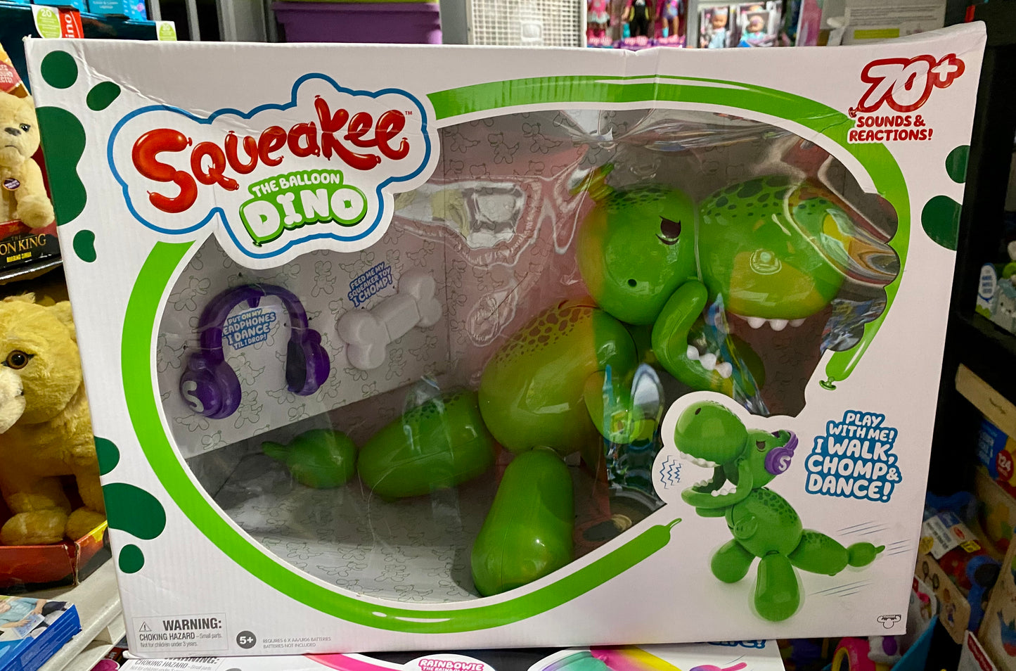 Meet Squeakee Dino! He's a stompin', chompin', dancin' Balloon Dinosaur! You've heard of the Stone-Age, well this guy's straight out of the "Blown-Age"! This guy's inflated with fun and personality. With 70 plus sounds and reactions, this toy dino will really "Wow" you! Squeakee Dino is so interactive and loves playing games. He reacts to sounds. Roar at him and he'll roar back. Roar at him too much and he might run away or even pop! This playful Dino loves his Bone Squeaker Toy. He walks and responds to its noise. Pet his nose and he'll nuzzle, and stomp or tickle him to make him laugh hysterically. There are so many games you can play with Squeakee Dino. He loves a good game of Tug Of War with his Squeaker Toy. Or maybe even play a game of Chicken by placing your finger in his mouth, but be careful, he's a quick chomper! Squeakee Dino is also an amazing dancer. Put his headphones on and watch him bust a move while he breakdances! You can even make your pet Dino pop or even fart by pulling his tail, but don't worry, just pump Squeakee Dino's tail to inflate him again! This amazing electronic toy is so funny and interactive and he's just bursting to be your BBF! (Balloon Friend Forever).